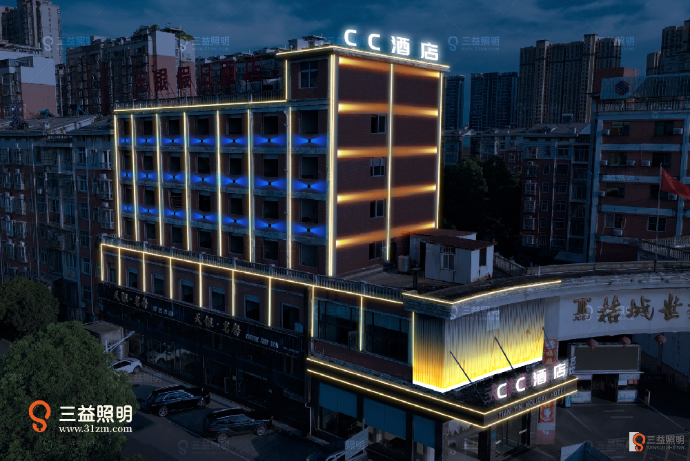 益陽市銀座商務(wù)酒店外墻燈光設(shè)計項目,本項目采用LED發(fā)光字,LED線條燈,LED十字星燈等燈具,對外墻進行亮化。